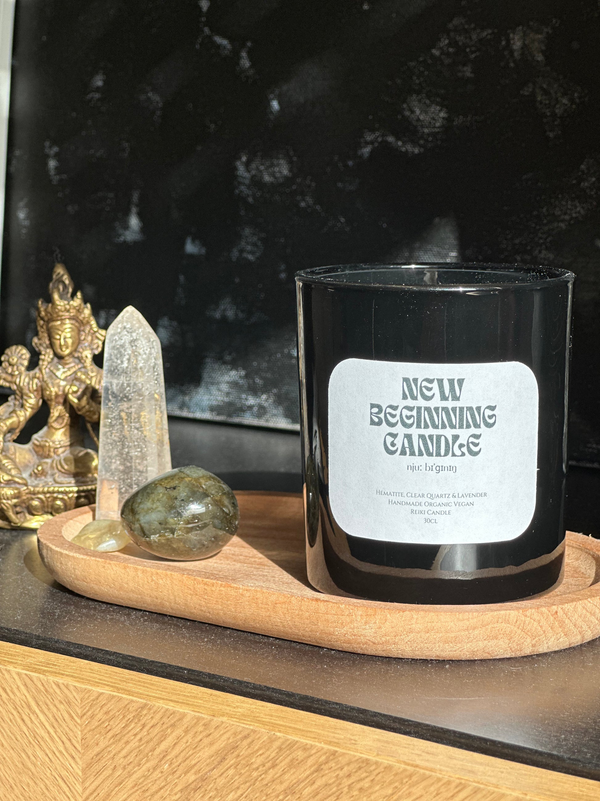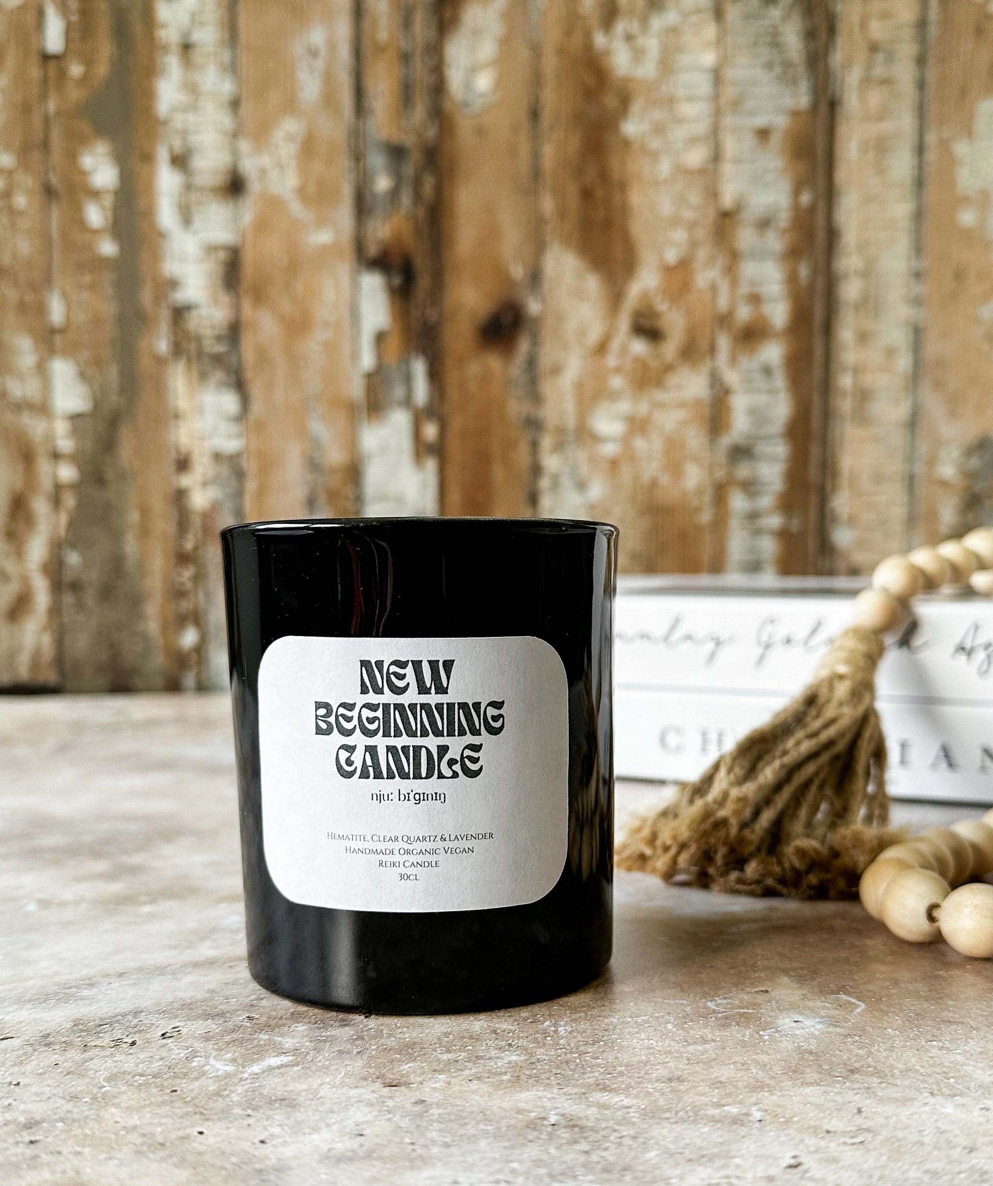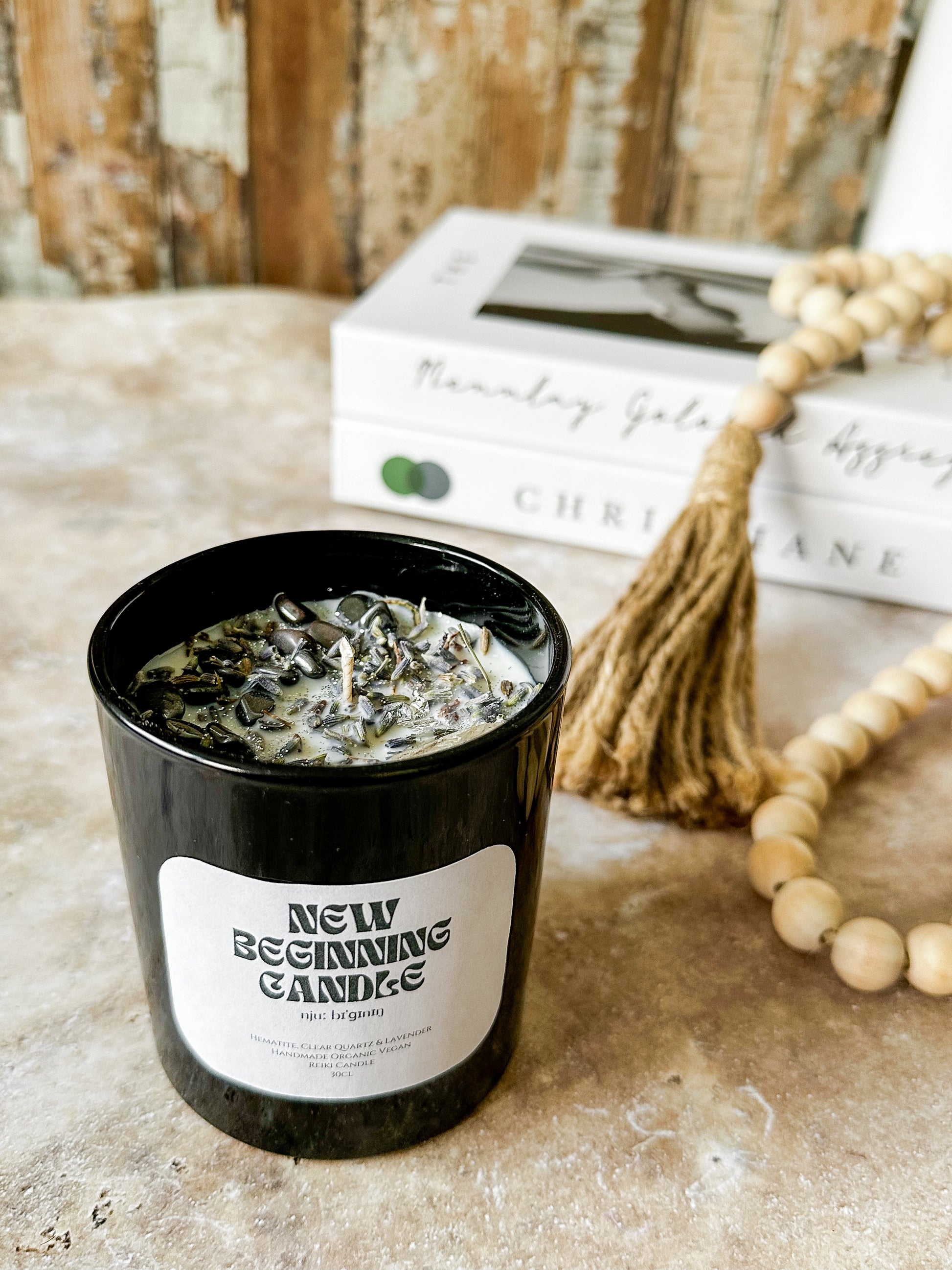Kristallkerze Neubeginn – Hämatit & Lavendel