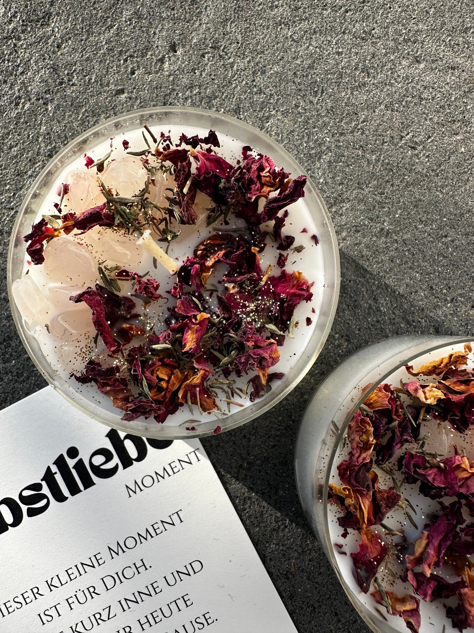 Ein liebevoll gestaltetes Selbstliebe-Teelicht mit Rosenquarz, Thymian und Rosenblüten. Brenndauer ca. 8 Stunden. Mit begleitender Audio-Meditation für Selflove. In einer klaren, recycelten Hülle, die ein besonders warmes, strahlendes Licht erzeugt.