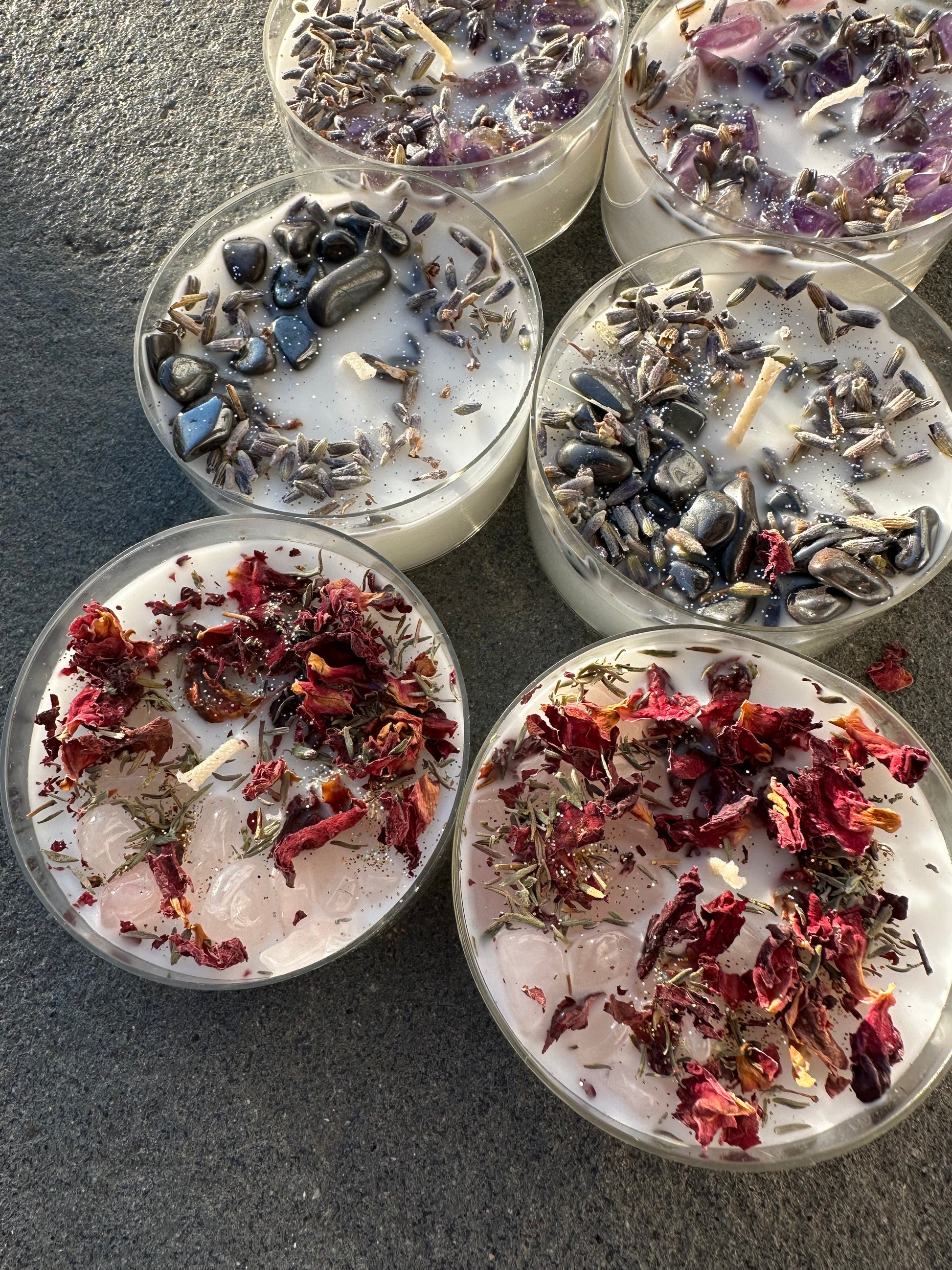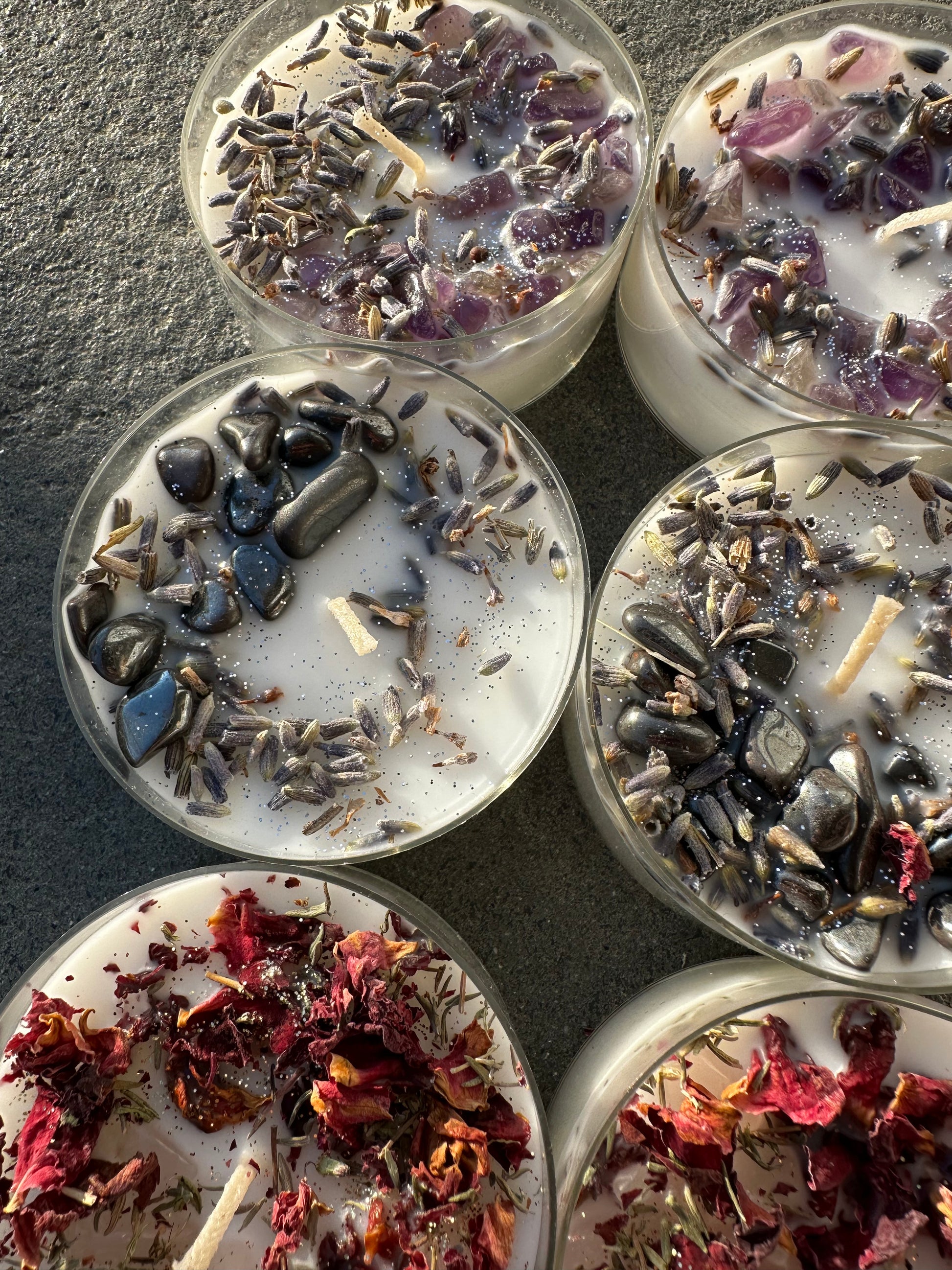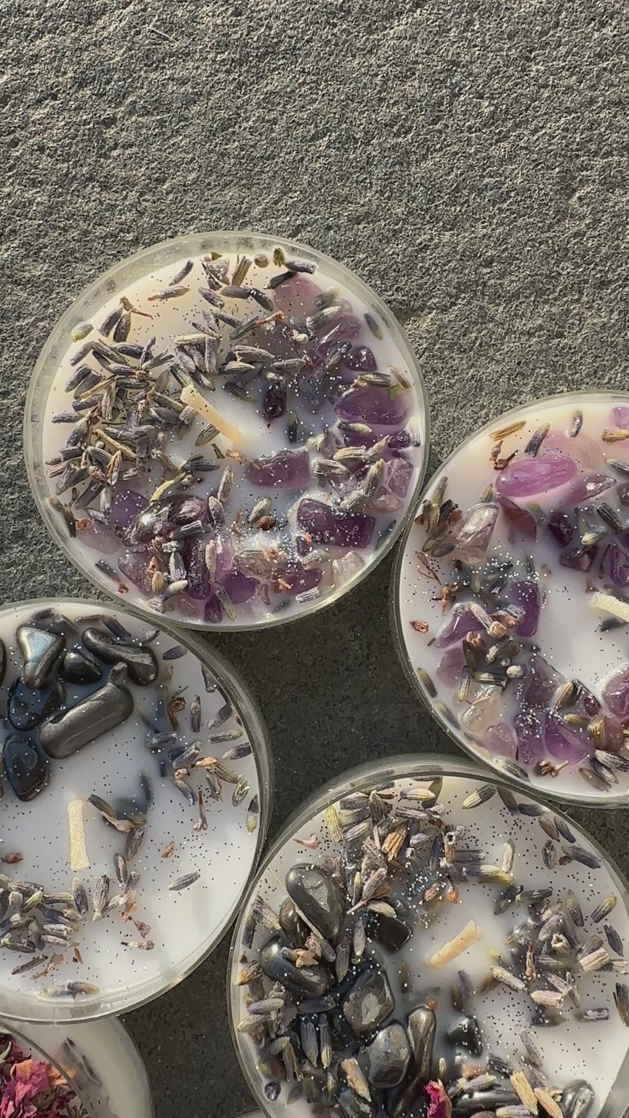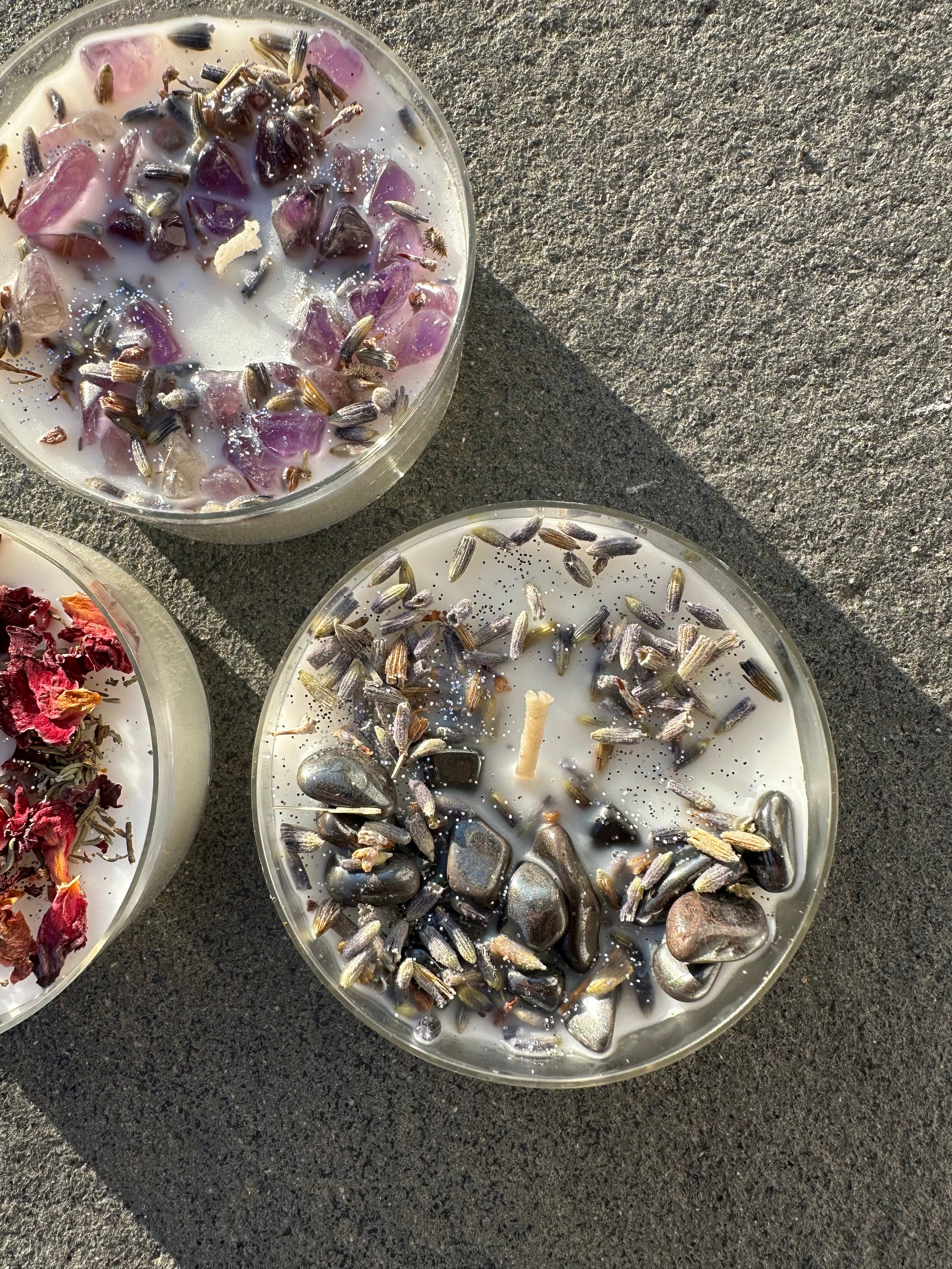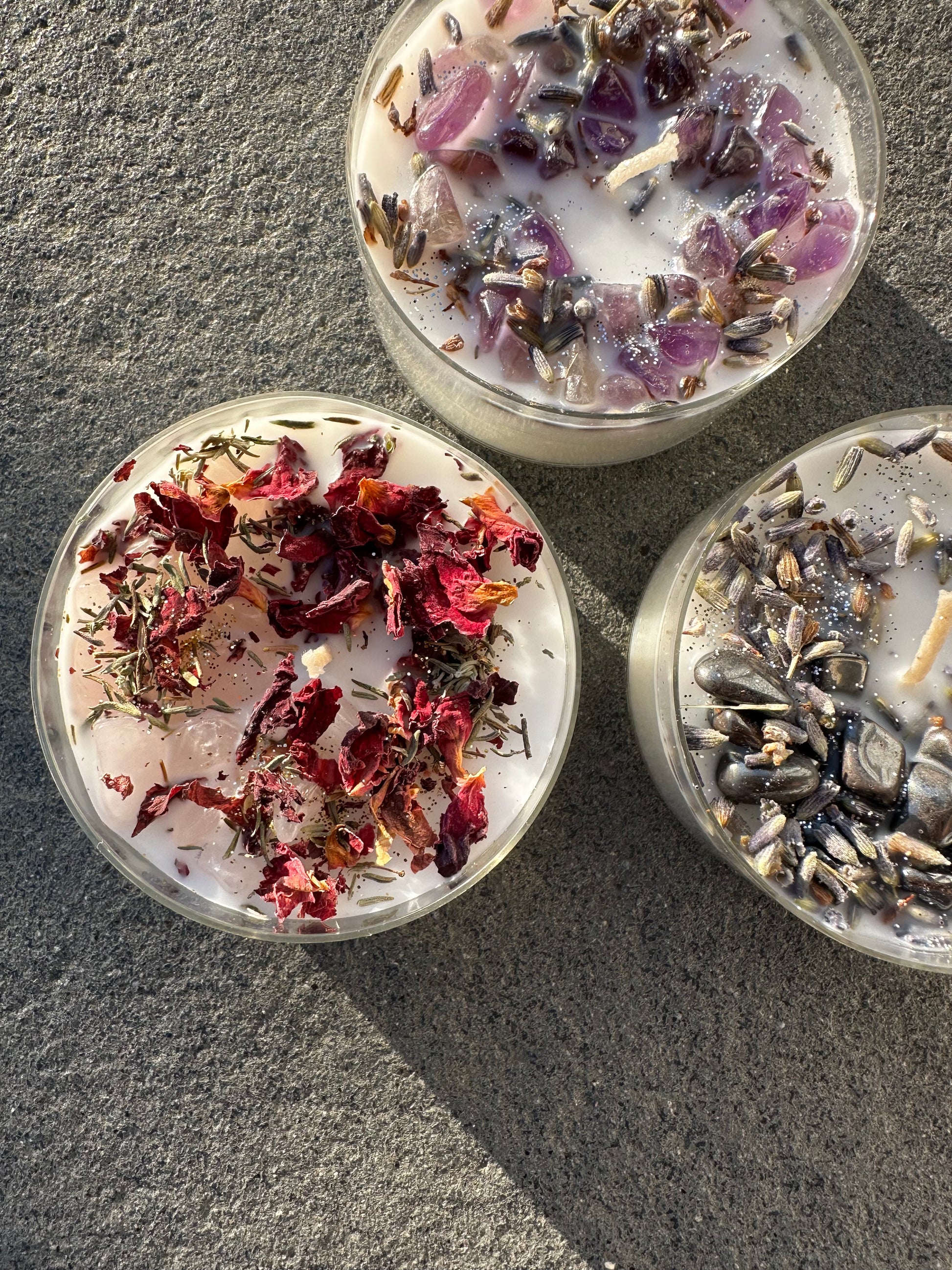 Dieses exklusive Kristallkerzen-Bundle enthält drei große Teelichter, dekoriert mit echten Heilsteinen und natürlichen Blüten. Es ist das ideale Set für Self Care, spirituelle Rituale oder als liebevolles Geschenk für Frauen, die Magie, Entspannung und besondere Momente schätzen.